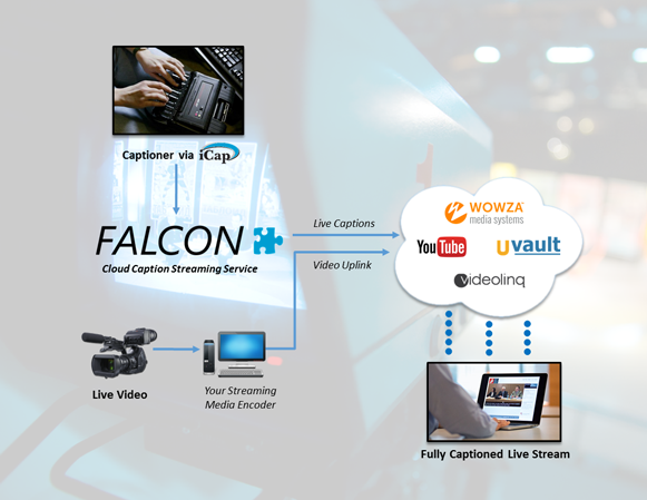 Comprehensive tutorial on how to route live closed captions through popular web video services such as Wowza Media Systems and YouTube Live Events using Falcon, EEG's cloud-based caption encoding service Falcon.