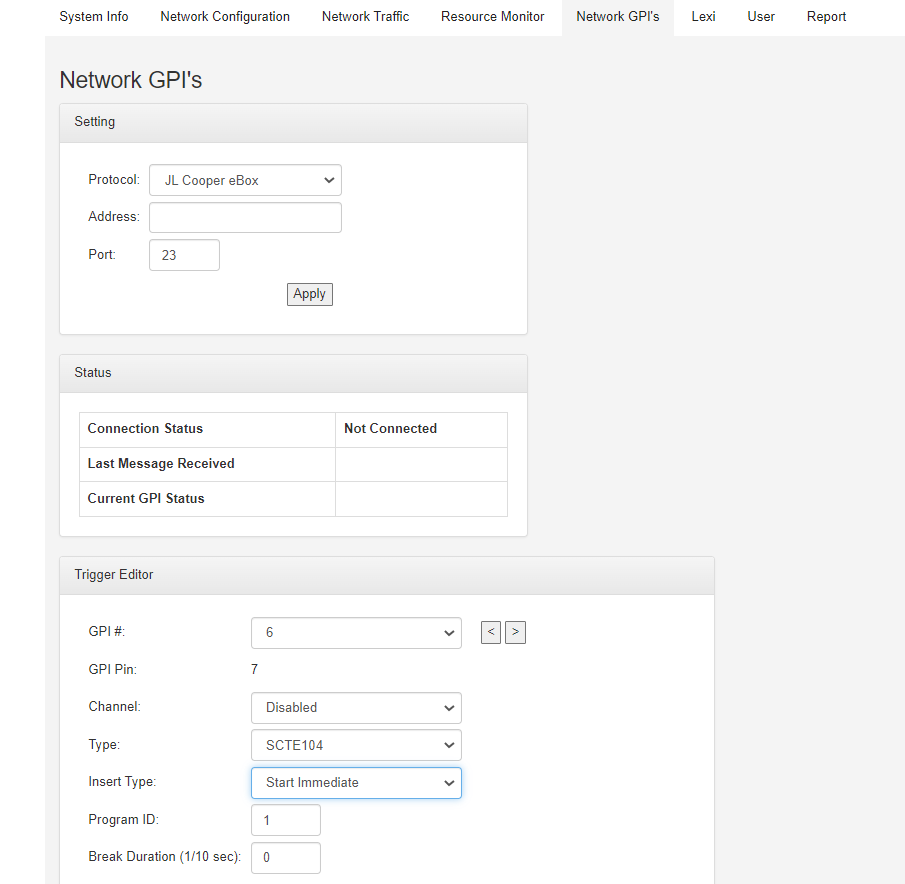 2) You can configure built-in presets on the Alta webpage (see screenshot attached), each assigned to a GPI number, to trigger SCTE-104 commands (that will then be injected as SCTE-35 into the TS) either via virtual GPI, using a GPI over IP protocol, or by sending HTTP requests to an API endpoint we provide.